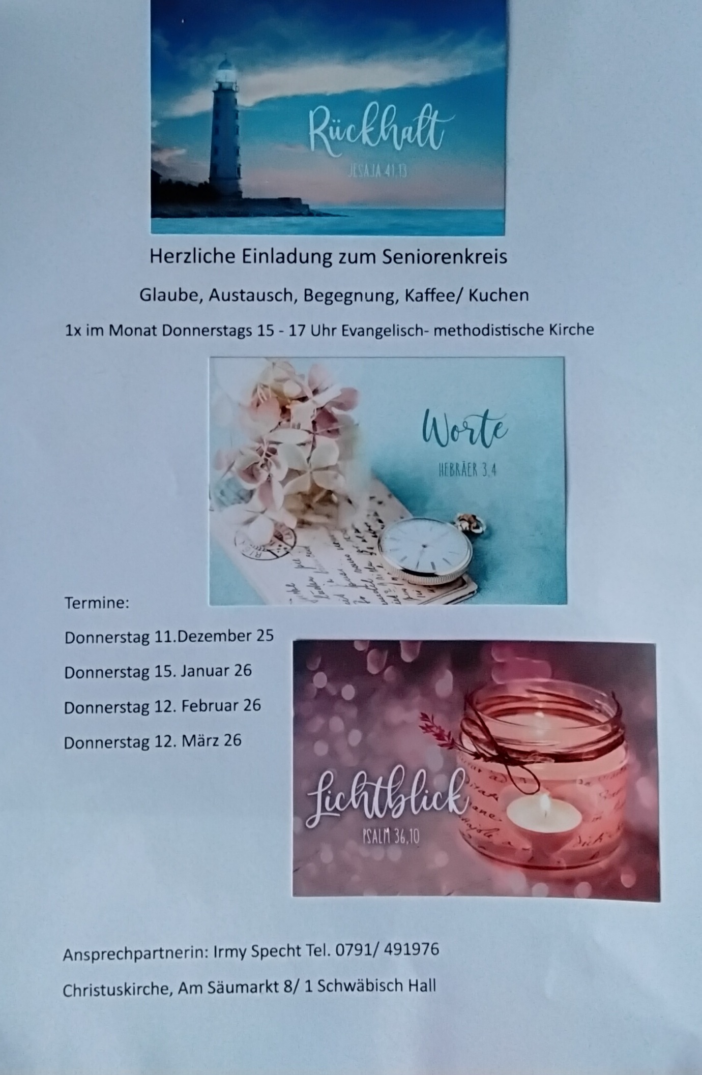 Herzliche Einladung zum Seniorenkreis! Glaube, Austausch, Begegnung, Kaffee und Kuchen. 1x im Monat donnerstags 15-17 Uhr.